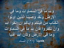 وَلِلَّهِ مَا فِي السَّمَاوَاتِ وَمَا فِي الْأَرْضِ ۗ وَلَقَدْ وَصَّيْنَا الَّذِينَ أُوتُوا الْكِتَابَ مِنْ قَبْلِكُمْ وَإِيَّاكُمْ أَنِ اتَّقُوا اللَّهَ ۚ وَإِنْ تَكْفُرُوا فَإِنَّ لِلَّهِ مَا فِي السَّمَاوَاتِ وَمَا فِي الْأَرْضِ ۚ وَكَانَ اللَّهُ غَنِيًّا حَمِيدًا ﴿١٣١﴾.
