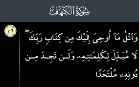 وَاتْلُ مَا أُوحِيَ إِلَيْكَ مِنْ كِتَابِ رَبِّكَ ۖ لَا مُبَدِّلَ لِكَلِمَاتِهِ وَلَنْ تَجِدَ مِنْ دُونِهِ مُلْتَحَدًا ﴿٢٧﴾.